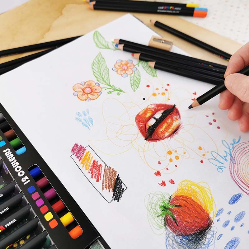 The Posca coloured pencil is a hybrid oil and wax based. It is suitable for a wide range of graphic techniques. It is perfect for sketching, colouring in numbers, illustrations, watercolours, to enhance gouache or marker creations.