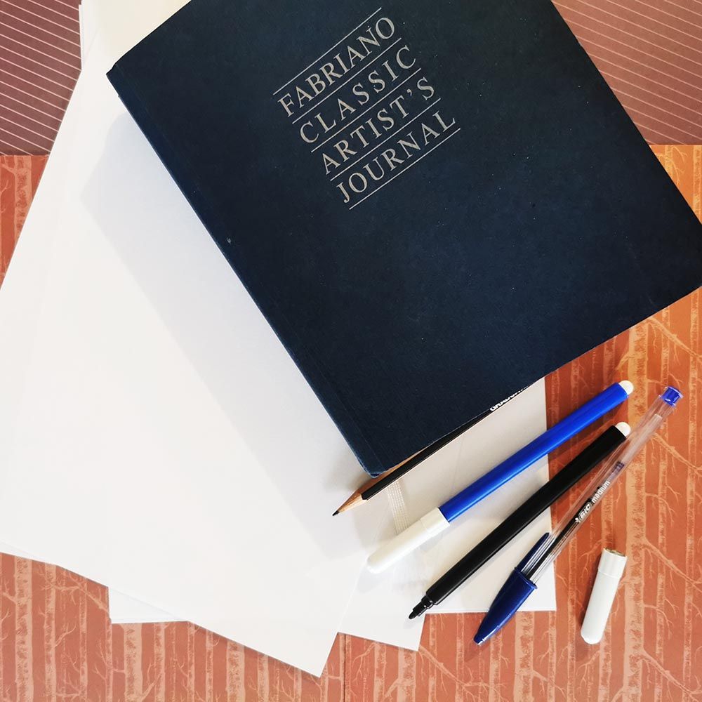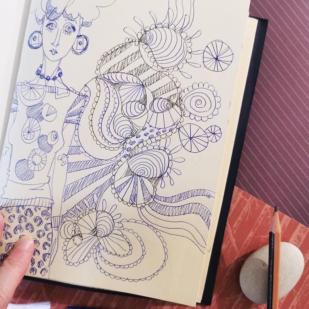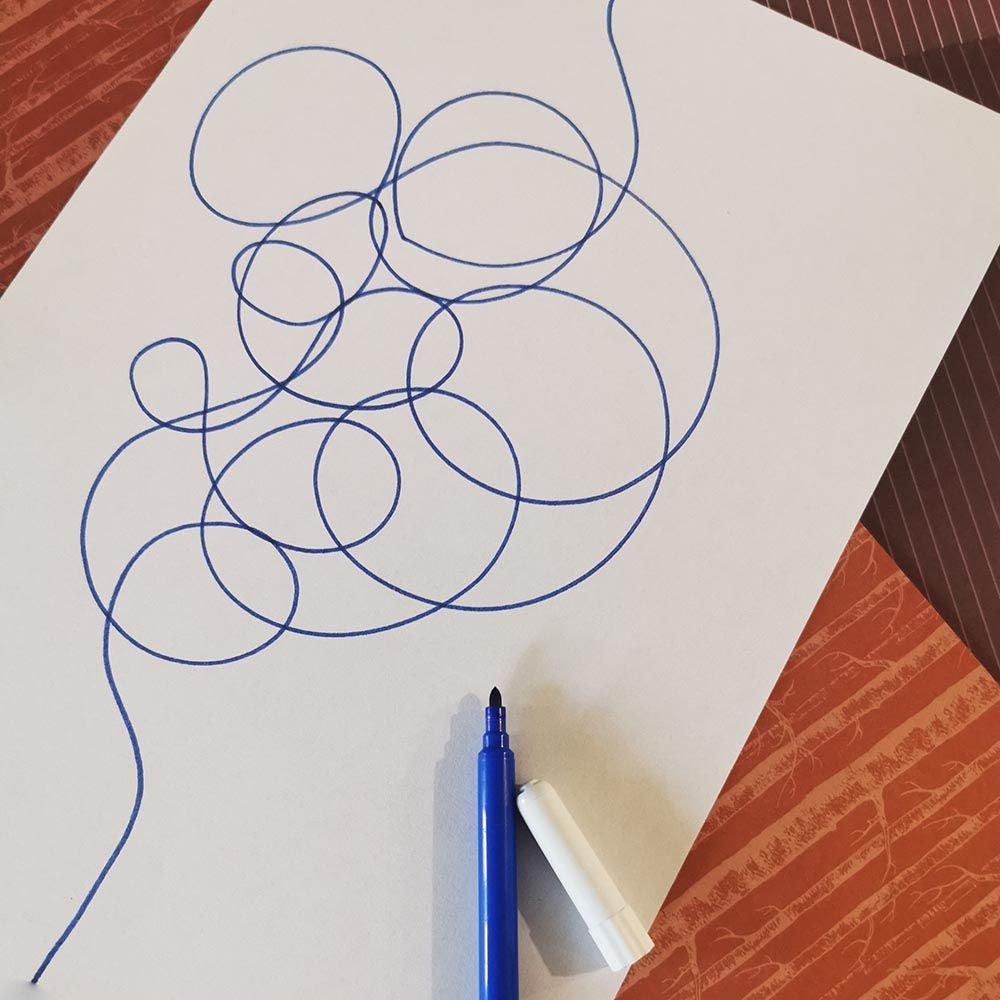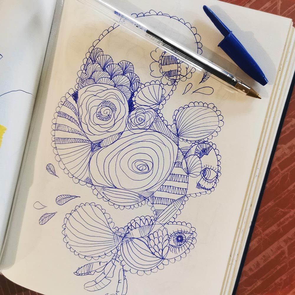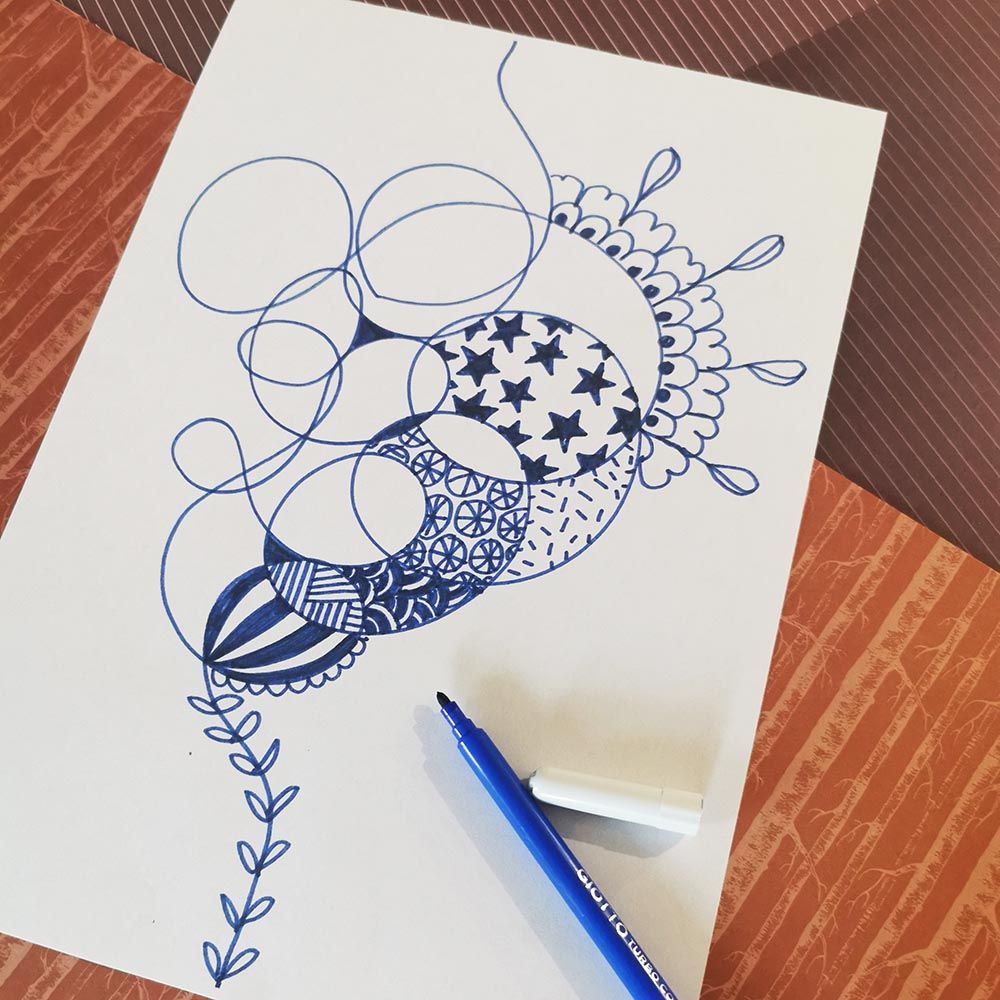 A graphite pencil, a pen or a black marker (the colour blue though, is much more relaxing) accompanied by a sheet of paper, a post-it note, a corner of a newspaper or a notebook can be excellent supports to express yourself and let go.